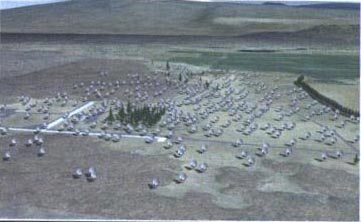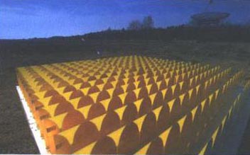 ![]() Chuỗi chùm. Thay vì lắp đặt các kính phản xạ hình parabol, Mỹ và Ấn Độ đưa ra các chùm 4400 ăngten parabol nhỏ đường kính 12m, được sản xuất hàng loạt để hạ giá thành. 2200 các parabol này được tập trung trong một vòng tròn đường kính 5km, 1100 đặt trong vòng tròn đường kính 150km, số còn lại trải dài trên 300km. |