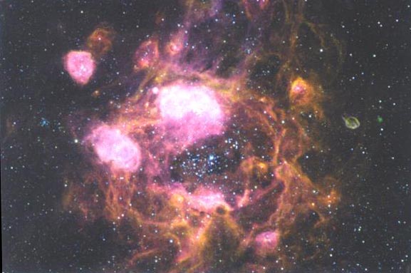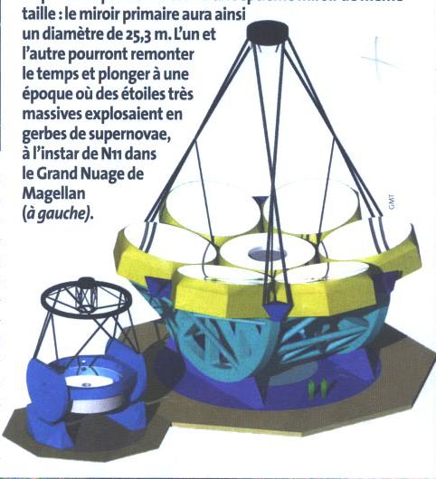 TMT và GMT của Mỹ. Đây là hai dự án khác nhau nhận được sự hỗ trợ của nhiều trường đại học và viện khoa học. TMT (trên) sẽ gồm 700 gương hình lục lăng được tổ chức thành một tổng thể đường kính 30m. Từ năm 2015, nó sẽ quan sát bầu trời qua ánh sáng hồng ngoại và ánh sáng nhìn thấy được. GMT (dưới) cổ hơn, với 6 gương nguyên khối mỗi gương 8,4m (bằng kích thước các gương của VLT) được xếp thành hình cánh hoa quanh một gương thứ bảy cùng cỡ, tạo ra một gương có đường kính 25,3m. Hai kính thiên văn này có thể lần ngược thời gian và trở về một thời kỳ ở đó các ngôi sao rất nặng bùng nổ thành các chùm supernovae, giống như N11 trong Đám mây Magellan Lớn (giữa)