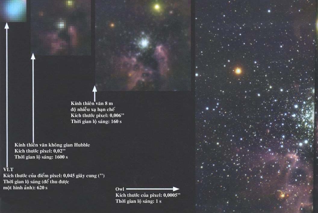 Bốn phim âm bản bên trái cho thấy một mô phỏng hiệu năng của Owl, so với các loại kính thiên văn khác. Cú nhảy vọt về chất lượng giữa VLT và Owl tương tự như bước nhảy vọt từ quan sát thiên văn bằng mắt trần sang quan sát thiên văn bằng kính thiên văn Galileo. Hình trên, sơ đồ hoạt động của Owl cho thấy các photon được tiếp nhận bởi gương thứ nhất đường kính 100m sẽ được nối với một gương thứ hai đường kính 25,6m. Hình ảnh thu được, vì bị biến dạng bởi các dòng khí chảy rối, nên sẽ phải được chỉnh bằng một hệ thống quang học thích ứng gồm bốn gương có thể điều chỉnh hình dạng.