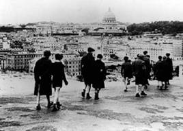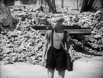 ![]() Cảnh quay nổi tiếng trong phim Germany Year Zero: cậu bé Edmund nhỏ nhoi và lạc lõng giữa khung cảnh đổ nát của thành phố |