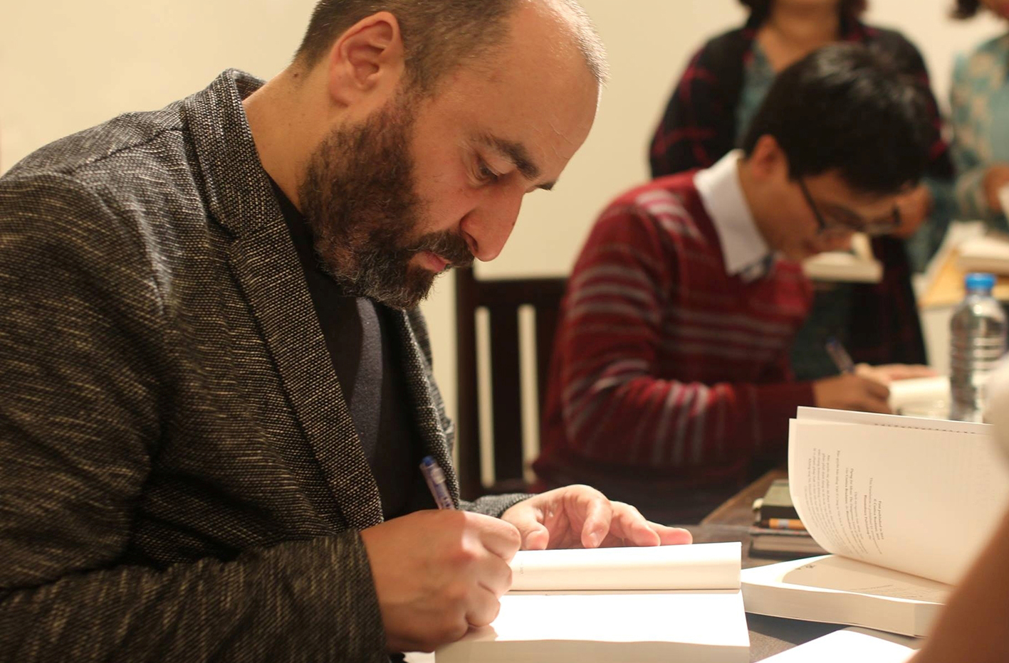 GS Costica Bradatan ký tặng sách tại Manzi Art Space, Hà Nội, 5/4/2017. Ảnh: Phong Thu.