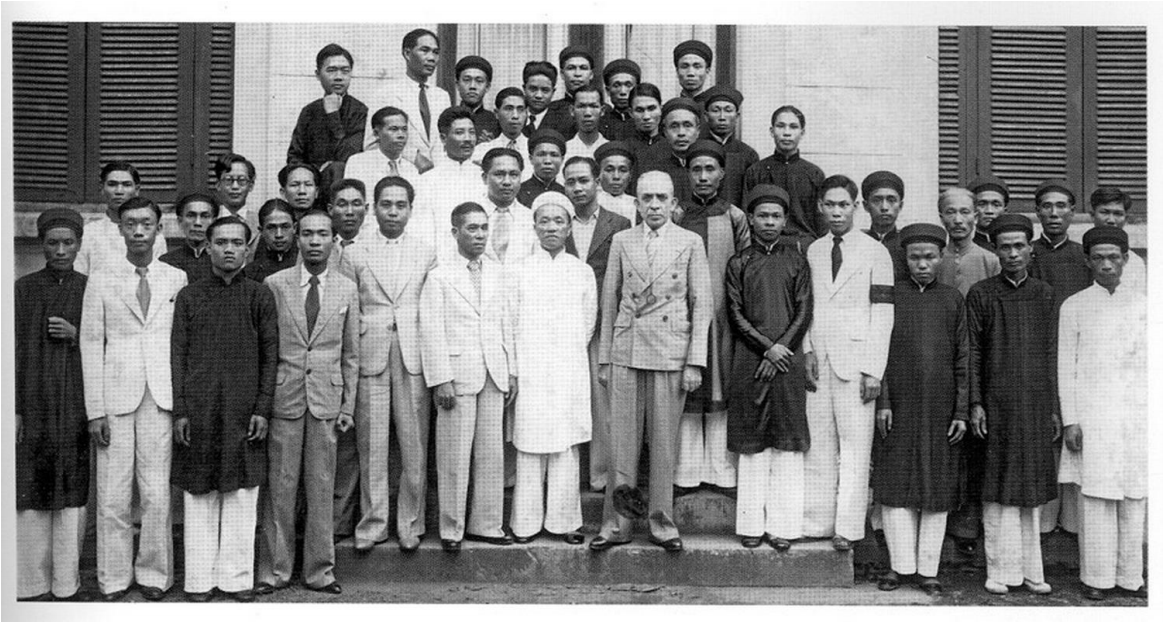 Giám đốc EFEO George Cœdès, Nguyễn Văn Tố (mặc bộ quần áo dài trắng) và các thành viên, nhân viên Việt Nam tại EFEO. Ảnh chụp năm 1936, tại trụ sở EFEO (26 Đại lộ Carreau, nay là phố Lý Thường Kiệt, Hà Nội). Ảnh lưu tại Thư viện KHXH. Nguồn: Ngô Thế Long/Thông tin KHXH,số 11.2016.