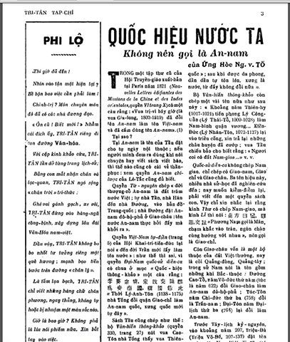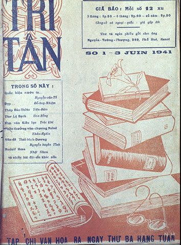 Tri Tân là tạp chí có chiều sâu về học thuật và có đóng góp quan trọng về khảo cứu sử học, văn học cổ Việt Nam giai đoạn trước Cách mạng Tháng Tám năm 1945 với nhiều bài viết và sự góp mặt của nhiều cây bút, trong đó đặc biệt là Ứng Hòe Nguyễn Văn Tố (1889-1947). Trong ảnh: Bìa và Lời Phi lộ (tạp chí Tri Tân số 1, ngày 3/6/1941). Nguồn: Bảo tàng lịch sử Quốc gia.