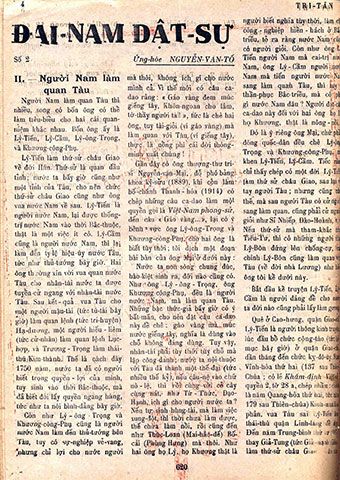 Tác phẩm “Đại Nam dật sử” (68 số, từ số 104, ngày 22/7/1943 đến số 209, ngày 25/10/1945), là công trình Ứng Hòe Nguyễn Văn Tố chưa viết xong. Tác giả mới viết được đến năm 1207, đời vua Cao Tông triều Lý, sau đó ít lâu thì ông hy sinh. Trong ảnh: Bài viết “Đại Nam dật sử” (Tri Tân số 105, ra ngày 29/7/1943). Nguồn: Bảo tàng lịch sử Quốc gia.