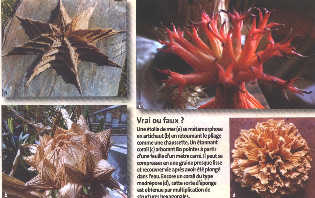 ảnh 4 (cụm gồm bốn ảnh): Thật hay Giả? Một con sao biển (a) biến thành cây áctisô (b) bằng cách lộn ngược chiều gấp như một chiếc tất. Một con san hô tuyệt đẹp (c) được làm bằng một tờ giấy khổ một mét vuông. Nó có thể được nén thành một hạt rất nhẵn và nở ra khi được ngâm xuống nước. Và đây nữa, một san hô tảng (d), tạo thành từ các cấu trúc hình lục lăng bằng giấy.
