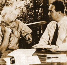 ![]() Bức ảnh này là cảnh dựng lại, chụp năm 1946: Szilard đang thuyết phục Einstein ký tên vào bức thư. |
