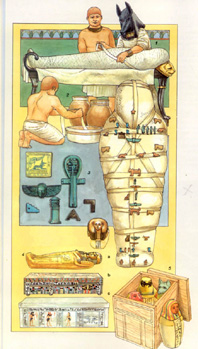 Ngoài ra, những tư liệu còn lưu giữ được cũng cho thấy cảnh ướp xác và tẩm hương thơm cùng những công đoạn và vật liệu được dùng cho việc ướp xác và tẩm liệm. Ở hình 8 là những người làm công việc tẩm hương thơm và những vật dụng cần thiết để chuẩn bị cho người qua đời mang sang thế giới bên kia: 1/Ở công đoạn quấn băng, người phụ trách chính công việc tẩm hương thơm mang mặt nạ hình chó rừng, tượng trưng cho thần Anubis, vị thần bảo vệ cho những người quá cố. 2/Tất cả những thành phần thuộc cơ thể người chết được quấn trong những lớp băng riêng. Ở mỗi công đoạn, người phụ trách việc tẩm hương thơm phải niệm những câu thần chú. Cũng có khi xác ướp được bọc trong một tấm vải liệm. 3/Một số tấm bùa chú mang những hình thù khác nhau được xếp xen vào các lớp băng quấn, với nhiệm vụ bảo vệ từng phần của xác chết, trong đó có những tấm bùa mang hình ảnh thần chó rừng Anubis. 4/Với những kẻ giàu có, xác ướp được đặt vào những lớp áo quan xếp chồng vào nhau được tạo nên từ vải lanh hay giấy papyrus nhúng trong thạch cao, và cuối cùng được đặt trong một cái quách bằng đá; (a)áo quan bên trong thuộc thời Tân Vương Triều, (b)áo quan thời Trung Vương Triều, (c)quách thời Tân Vương Triều. 5/Gan, phổi, dạ dày và lòng được đặt trong những chiếc bình di hài và cất trong một chiếc hộp, bên cạnh quan tài.
