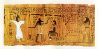 – Anubis trong cảnh cân linh hồn của Djet-Khonsou-ioufankh, tu sĩ của Amon và Thot, minh họa cho cuốn “Tử thư” bằng giấy papyrus đặt trong ngôi mộ của người quá cố. Anubis đang chủ trì buổi lễ cân linh hồn. Linh hồn được cân nhưng thay cho quả cân thông thường là một chiếc lông đà điểu, biểu tượng của thần Maât. Thần Thot đang ghi lại kết quả trên một tấm bảng thư lại. Người quá cố đưa tay lên cao nhằm biểu lộ sự ngay thẳng của mình. Nếu trái tim nặng hơn chiếc lông, thì điều đó có nghĩa là người quá cố là một kẻ tội lỗi (hình 7).