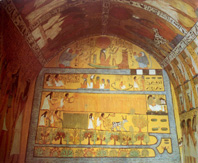 – Anubis (được thể hiện dưới dạng song đôi và đặt đối xứng) đang che chở cho Sennedjem và vợ trong nghi lễ tôn vinh mười ba vị thần của địa phủ, đứng đầu là Osiris và Ré-Horus (hình 4).