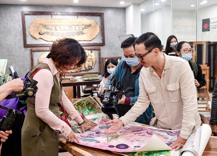 Họa sĩ Tạ Huy Long giới thiệu với khách mời các tác phẩm của mình tại buổi khai trương Xưởng Thứ Bảy. Ảnh: baophapluat