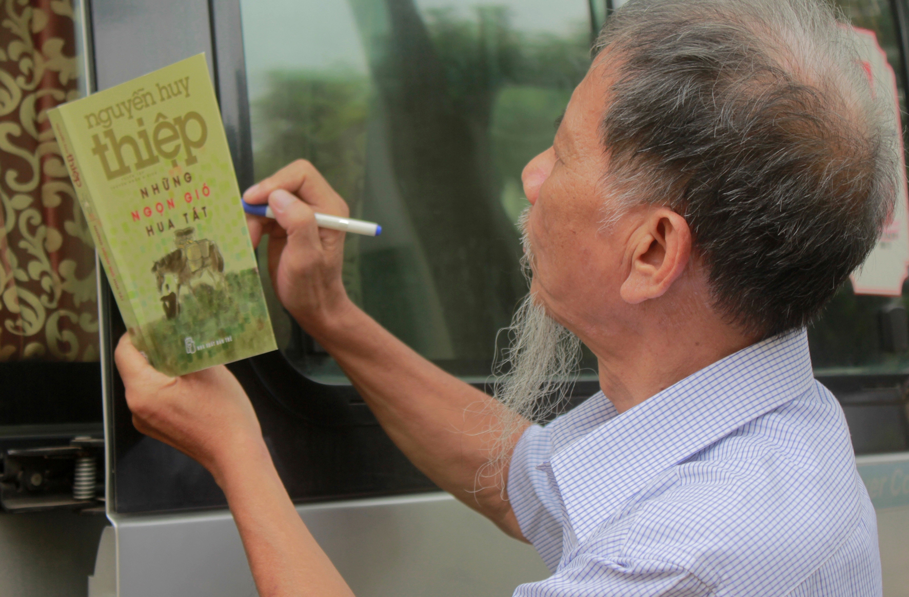 Nguyễn Huy Thiệp ký tặng tập truyện Những ngọn gió Hua Tát ngay tại sân trường cấp III Mai Sơn, nơi ông từng dạy học vào cuối thập niên 1970. Ảnh: Mai Anh Tuấn.
