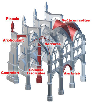Giải pháp mới được đưa ra phải làm thế nào đó để hài hòa giữa các lực tác động. Hai sáng chế gothique lớn nhất lúc đó chính là mái vòng cung và mái chéo hình cung nhọn. Để không phải sử dụng những bức tường quá dày, cần phải tìm cách khác để gắn kết các mái vòm này, giúp giảm tải sức nặng của mái vòm và các tầng khác nhau của nhà thờ.