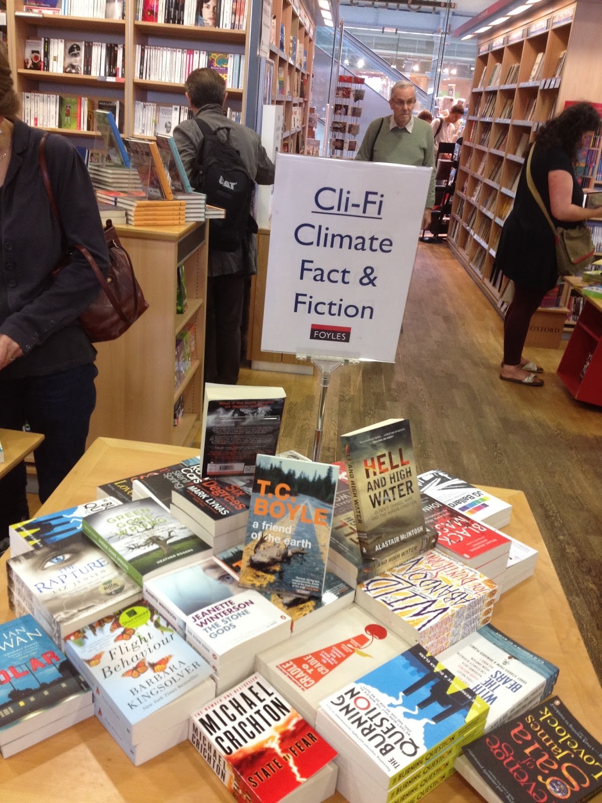 Cửa hiệu sách Foyles ở London đã dành một góc cho khoa học viễn tưởng về biến đổi khí hậu. Nguồn: teleread.com.
