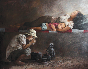 Katy vẽ họ, những người cùng cảnh ngộ, sinh hoạt thành từng tốp như để nương tựa, dựa dẫm, tìm kiếm nguồn an ủi lẫn nhau. Họ cùng đứng- ngồi- ăn- ngủ, các hành vi của nhân vật đôi khi lặp lại hệt như nhau như để khẳng định một sự hiện hữu, tồn tại nhất định nào đó. Và bao trùm lên tất cả là sự trống trải, cô đơn, nghèo nàn, im lặng. Các khuôn mặt căng thẳng, chờ đợi, những đôi mắt lo âu, khắc khoải về tương lai.