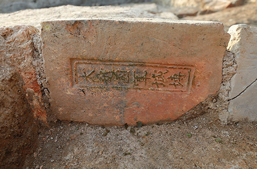 Viên gạch có chữ “Đại Việt quốc quân thành chuyên” được tìm thấy tại hố khai quật ở cánh đồng nằm giữa Đền Vua Đinh và Đền Vua Lê.