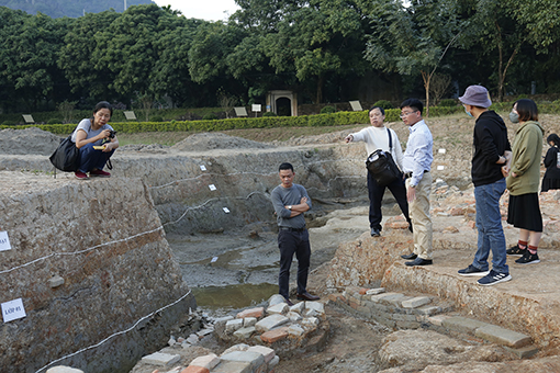 PGS.TS Tống Trung Tín, chủ trì cuộc khai quật năm 1998, và TS Nguyễn Ngọc Quý, chủ trì cuộc khai quật năm nay (lần lượt thứ 3, 4 từ trái sang), trao đổi với nhau tại hiện trường khai quật.