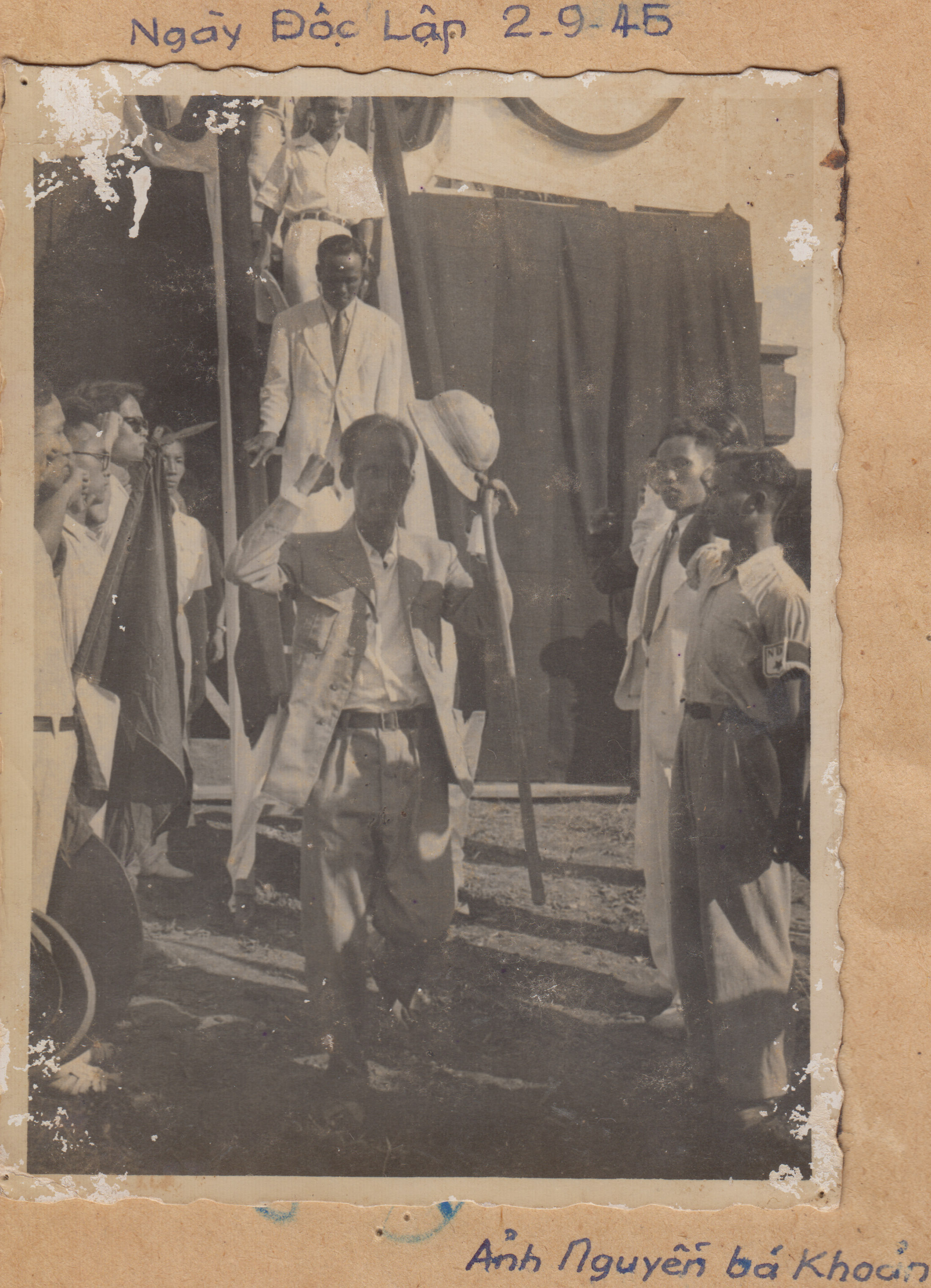 Chủ tịch Hồ Chí Minh bước xuống Lễ đài sau khi đọc Tuyên ngôn Độc lập. KTS Ngô Huy Quỳnh đeo kính đen. Ảnh: Nguyễn Bá Khoản. Nguồn: Tư liệu của Trung tâm di sản các nhà khoa học Việt Nam.