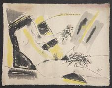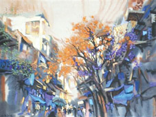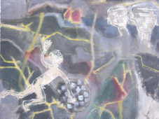 Mấy bức của Lý Sơn, mới so với anh nhưng người xem vẫn thèm cái thời kỳ Vân dại hồi những năm Tám mươi của Sơn. Lần này anh trưng những tranh mới vẽ, không phải màu nước mà là màu tự chế, màu tự nhiên, tự làm bằng vỏ cây, nước trà, đất cát gì đó. Những màu này không định được hoàn toàn theo chủ quan của hoạ sỹ, nó hợp với, kết hợp với chất Dó của giấy Dó để xanh không xanh, đỏ không đỏ, tất cả đều âm âm, ương ương, tai tái, nhờn nhợt. Tạo cảm giác thú vị về kỹ thuật.