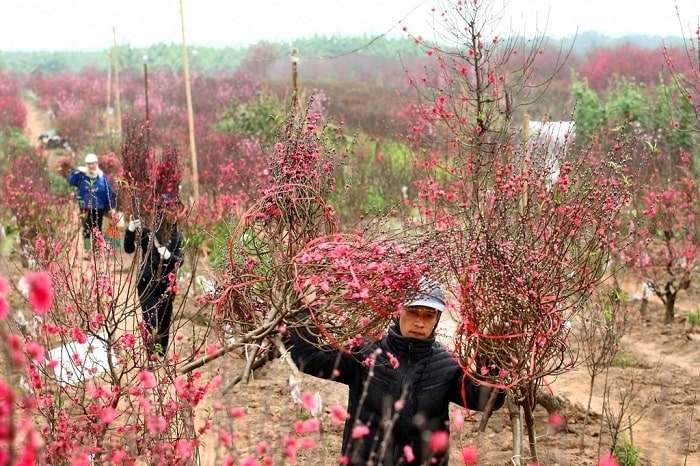 Người đi xe máy ghé qua, người đi xe hơi dừng lại… rồi từng bó từng cành lại theo người vào phố. Đường làng đã bê tông hóa nhưng vẫn bụi mù. Xe công nông chạy như điên, chở những chậu quất, đào từ phố về vườn trồng lại chờ tết sang năm. Xe chở phù sa ven sông đổ thêm cho đất vườn. Xe chở xà bần san lấp ao hồ xây nhà cao tầng… Làng hoa như bị đè bẹp bởi những ngôi nhà “bán đất” vây quanh, kiểu phân lô bán nền nửa quê nửa tỉnh. Đi mãi vào trong làng vẫn còn nhiều vườn đào nở rộ, đủ sắc hồng phai đào thắm… Những mảnh vườn ngày một hẹp đi, đầu vườn nào cũng là một gian nhà nhỏ xíu xấu xí, xây gạch trần vữa thô, cửa gỗ xộc xệch mà cái khóa rõ to, chắc để dụng cụ làm vườn hay ngủ canh trộm vào mùa hoa tết! Nhiều cây đào đã cưa sát gốc, nhiều cây hoa nở bung dày đặc trên cành, vài cây đào thế trông già cỗi thế mà vẫn cành thưa hoa thắm… Người phụ nữ cắp cái thúng nhỏ trong có bó lạt trắng ra vườn, tay tuốt từng bông hoa đã nở để cành chỉ còn nụ và lá non mới nhú. Dùng kéo bấm từng cành, lấy lạt buộc khẽ lại, chị xót xa: đào đẹp thế mà giờ có bán cũng chả được mấy đồng … Nhìn cánh hoa rơi rơi đỏ gốc lại nhớ nước mắt Lâm Đại Ngọc chôn hoa. Tự ngạc nhiên: cuộc sống xung quanh xô bồ vội vã thế mà mình vẫn còn thời gian để “sến”?!