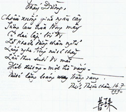 Vừa qua tôi lục giấy tờ cũ, tình cờ thấy một trang giấy có thủ bút của Thầy Thích Thiện Châu (cố Hòa Thượng Thích Thiện Châu), một bài thơ. Cảm động quá. Bài thơ này Thầy viết sau khi khóa Thiền mùa hè năm 1990 chấm dứt và là lần cuối cùng Thầy sang giảng khóa Thiền tại Muenchen.