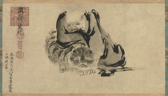 Nhị tổ điều tâm đồ (trích đoạn) (Thạch Khác – nghi vấn). Mực trên giấy. 64,4 cm – 35,3 cm. Bảo tàng quốc gia Tokyo, Nhật Bản.