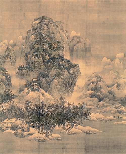 Tuyết cảnh hàn lâm đồ (Phạm Khoan – nghi vấn). Mực trên lụa. 193,5 cm – 160,3 cm. Bảo tàng nghệ thuật thành phố Thiên Tân, Trung Quốc.