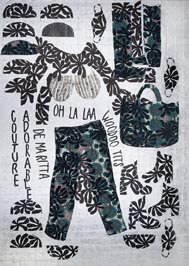 Maritta quyết định sau chuyến đi Benin, sẽ tìm kiếm một cơ hội để in lại các mẫu hình khối trên những bức vẽ với mặt bàn mica lên vải, và thiết kế trang phục. Cuối cùng, bà phải kỳ công sang tận Ấn Độ để có thể có được những mảnh vải in hoa văn bằng kỹ thuật số đạt chất lượng cao nhất. Một bộ gồm: một quần dài kèm một váy ngắn mặc ngoài, một áo lửng, một mũ nhỏ. Bà còn thiết kế túi nữa. Các món đồ này, trong một chừng mực nào đó, lại trở thành chất liệu trên tranh. Bà đính chúng lên bề mặt toile đã được phủ kín bằng quỳ bạc, hồ cứng chúng lại sau khi đã tìm cho chúng những vị trí thích hợp. Xung quanh chúng, bà có thể tạo hình thêm những nét hoa văn khác, hoặc chữ – tên bà, tên Hà Nội, cái tên thú vị của một địa chỉ may vá ở Benin,… Có bức tranh lạ kỳ hơn, bề mặt toile được phủ kín quỳ bạc, khung tranh được phủ bằng vải in họa tiết kể trên. Vậy là xong. Nghĩa là, cho đến lúc này, với Maritta, mọi thứ đều có thể… Chúng đặt ra câu hỏi: nghệ thuật có thể là gì? Có thể là tất cả hoặc cũng có thể chẳng là gì chăng…