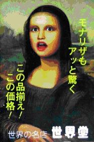 Trái: Đại bản doanh của Sekaido tại Shinjuku (Tokyo). Phải: Biểu tượng của Sekaido: Mona Lisa cũng phải há miệng kinh ngạc vì sự phong phú của hàng hoá và giá rẻ ở đây.