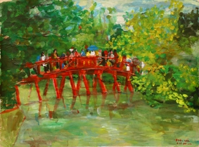 mà bảy họa sĩ vẽ Hà Nội còn người thứ tám là nhà nhiếp ảnh Trần Quốc Khanh chụp và nhà quay phim Vũ Đức Tùng, người thứ chín, quay cảnh các họa sĩ đang vẽ. Hình như đã có nhiều ảnh và phim về phong cảnh Hà Nội nhưng ít những hình ảnh các họa sĩ đang vẽ Hà Nội. Đã có nhiều triển lãm tranh nói chung, tranh vẽ cảnh đẹp Hà Nội nói riêng nhưng người xem vẫn thèm được xem hình ảnh của các họa sĩ đang làm việc, các thao tác nghề nghiệp, các chuyện đằng sau bức tranh, các chi tiết bếp núc làm nên tác phẩm.Cầu Thê Húc – Nguyễn Đình Vũ |
