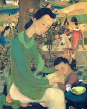Hãy lấy ngay một ví dụ trong bài, trạng thái “quá ngán” với những Mẹ và Con của Vũ Cao Đàm: một chuỗi hình ảnh lặp lại, ngọt ngào đến mức thành trở thành kitsch. Sự ngấy ngán này phản ánh một tâm thế hậu hiện đại – tâm thế của một thế giới đã mệt mỏi với những biểu tượng của tình cảm, thiêng liêng hay cái đẹp thuần khiết. Vũ Cao Đàm vốn nằm trong quỹ đạo của Trường Mỹ thuật Đông Dương và sớm hấp thụ tinh thần tạo hình phương Tây qua sự truyền thụ của hai thầy Tardieu và Inguimberty. Song khác với nhiều đồng học khi sang Pháp, ông không chọn con đường hiện đại hóa bằng những cú sốc hình thức, mà bằng sự “dịu hóa” của hiện đại – một modernité douce: tinh tế, lặng lẽ, hướng tới cái phổ quát của con người thông qua biểu tượng truyền thống, là cấu trúc mỹ học nhân bản, nơi hai lực đối nghịch – tính cá nhân tự trị của nghệ thuật phương Tây và tính cộng cảm của truyền thống Á Đông – được hòa giải.