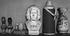 Mấy đồ vật ở bức ảnh này dường như ai cũng đã từng thấy, quen thuộc, chính xác là quen mắt, nhiều người, nhiều nhiếp ảnh gia đã nhìn nhưng không thấy, không chụp, không phát hiện ra được câu chuyện sau những vật tưởng như vô tri này. Họ không làm cho những đồ vật ấy cất tiếng. Như đã nói, nhìn bức ảnh này thì thấy rất dễ chụp, người không biết chụp cũng chụp được, ánh sáng tự nhiên, không đèn đóm, bố cục giản dị, máy không hất lên, không chúc xuống, ống kính không zoom, không wide… tất cả đều hướng đến cái mục tiêu tối thượng của nhiếp ảnh là trung thực. Nhìn sao chụp vậy, có sao nói vậy. Nhưng nói tức là những đồ vật tự nói chuyện của chúng chứ không phải là nhiếp ảnh gia nói, nói hộ bằng kiểu sắp xếp lại hoặc thêm mắm thêm muối để cài cắm, áp đặt ý tưởng nọ kia vào những đồ vật đó. Bàn kỹ một chút như thế bởi vì có một số người chụp mắc bệnh này. Trước hiện thực, nhiếp ảnh gia chỉ là người phát hiện vấn đề, hướng ống kính vào đó và để hiện thực kể câu chuyện của mình, người chụp tuyệt đối không được “xỏ nhầm giày” không được kể thay. Chỉ như thế, bức ảnh mới có sức thuyết phục. Lưu ý đây không phải là một bức ảnh cổ, Phạm Đức Long mới chụp năm 2007, hai cái đèn dầu với phần bầu đèn bằng gốm và cái vỏ phích nước Rạng Đông bằng nhựa là những sản phẩm đời mới. Nhưng lạ thay, vẫn có một điều gì đó cũ kỹ và một cảm giác tĩnh lặng trùm lên bức ảnh. Thời gian dường như ngưng đọng. Thời gian trôi qua ngôi nhà này như chậm lại. Từ đèn dầu, phích nước đến cái lọ hoa gốm Bát Tràng này là những đồ vật mới, mới nhưng làm kiểu cũ, làm bằng chất liệu mới nhưng design thì vẫn cũ. Mấy đồ vật này, mấy đồ vật mới – cũ này là những đồ ít tiền, cho người bình dân và cho những người cũ, những người kiểu cũ, những người già, những người còn giữ nếp cũ. Vào những gia đình kiểu cũ bao giờ cũng thấy có phích nước sôi để sẵn trong bếp, mấy cái đèn dầu, mặc dù bây giờ đã có nhiều loại phích dùng điện, bây giờ ở thành phố ít khi bị mất điện nhưng nếp cũ là vậy, giản dị, bình lặng và an lành. Thời trước cuộc sống đầy bất trắc nên chỉ những người cũ mới có thói quen đề phòng thế. Không phải tình cờ mà tác giả để cho một đồ vật cũ duy nhất (cũ đúng nghĩa) nằm ở trung tâm của bức ảnh, đó là bức tượng bằng thạch cao, chân dung nhà soạn nhạc thiên tài người Đức Ludwig van Beethoven (1770-1827).