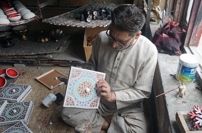 Barkat Ali, 50 tuổi, bước vào xưởng của mình ở Srinagar vào tám giờ sáng, tập trung vào việc vẽ các đường trang trí trên lọ, hộp và những đồ khác. Ông chỉ kiếm được khoảng ít hơn 300 rupe (3/3,50 USD) mỗi ngày. “Tôi không thể làm tiếp việc này nữa, tôi có hai con nhưng ở tuổi này rồi, tôi không thể học thêm nghề nào khác. Đó là lý do tại sao đến giờ tôi vẫn tiếp tục làm nghề”, Ali nói.