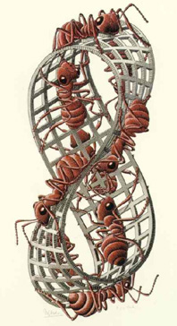 Hình 1: Lá Mobius II minh họa những chú kiến bò theo một con đường bất tận. Với một số hữu hạn các hình họa, Escher đã miêu tả sự vô hạn qua một hành trình liên tục của một chu trình không có điểm kết.