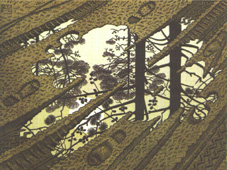 Hình 7: Vũng nước (1952), SỰ PHẢN XẠ cho phép những hiện tượng quá nhỏ, quá xa hoặc quá mờ có thể được quan sát một cách trực tiếp. Một vũng nước trên nền đất rừng đầy dấu giày và vết bánh xe soi bóng những vòm cây và ánh trăng ở phía trên. Escher nhắc chúng ta rằng, còn có một thế giới không nhìn thấy ở bên dưới, đằng sau và ở trên cái nhìn của chúng ta.