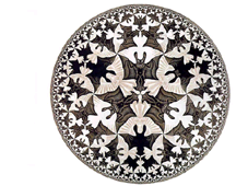 Hình 4: Giới hạn Hình vuông (1964), TÍNH TỰ TƯƠNG ĐỒNG được tạo ra bằng việc sử dụng một chủ đề có tính chất đệ quy, một khám phá của chính Escher. Một tập hợp các hướng được lần lượt áp dụng cho một vật thể để tạo ra những vật thể mới. Sau đó mỗi vật thể mới lại được đặt vào tập hợp các hướng để tạo ra các vật thể mới khác, cứ như thế, quá trình kéo dài đến vô hạn. Nó được gọi là thuật toán đệ quy. Sản phẩm cuối cùng có tính chất tự tương đồng khi các vật thể cuối giống hệt vật ban đầu, ngoại trừ những thay đổi về tỷ lệ, sự định hướng và vị trí.
