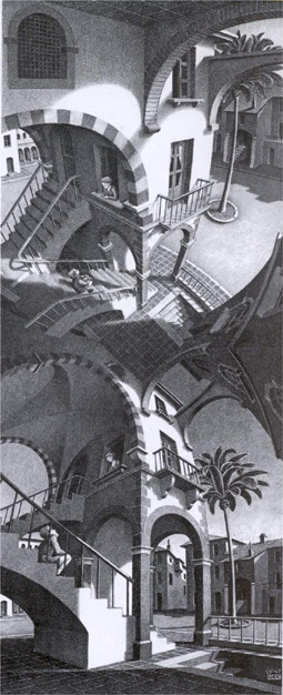 Hình 6: Cao và thấp (1947), TÍNH TƯƠNG ĐỐI phát biểu rằng, sự quan sát của một người phụ thuộc vào ngữ cảnh và vị trí. Trong bức tranh in đá này, Escher đã biểu diễn hai cái nhìn khác nhau đối với cùng một cảnh. Trong nửa dưới bức tranh, người quan sát ngồi trên một sân gạch, và trong nửa trên, người quan sát đang nhìn xuống dưới. Bây giờ, một câu hỏi được đặt ra: cái mặt phẳng được lát gạch ở trung tâm bức tranh là sàn nhà hay trần nhà? Escher đã dùng nó để biểu thị cả hai, và để liên kết hai cái nhìn. Ta không thể nhìn toàn bộ bức tranh theo một cách logic. Cảnh này cũng minh họa cho một điều là, sự gắn kết những cái nhìn cục bộ để tạo nên một cái nhìn toàn thể có thể dẫn đến những mâu thuẫn.