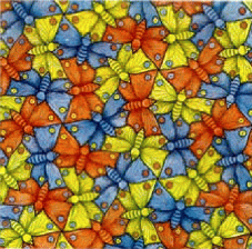 Hình 3: ĐỐI XỨNG là một khái niệm mang tính cấu trúc mà định dạng nên rất nhiều mô hình toán học và vật lý. Trong bức tranh, những con bướm dường như lấp đầy trang giấy một cách ngẫu nhiên, song trên thực tế mỗi con lại được đặt vào một vị trí chính xác và cũng được bao quanh một cách chính xác bởi các con khác. Luôn luôn có 6 con bướm xoáy quanh một điểm, nơi các đầu cánh trái trước của chúng gặp nhau. Và tại điểm mà các đầu cánh phải sau gặp nhau thì luôn có ba con vây xung quanh. Luôn có một cặp bướm nằm trên đường rìa các cánh phải trước. Cùng với đối xứng quay, bức họa còn có đối xứng tịnh tiến theo một đường kẻ tam giác. Mẫu hình này có thể được tiếp tục mãi mãi theo tất cả mọi hướng và cho ta một sự ẩn dụ về tính vô hạn. Sự chú tâm của Escher vào màu sắc được liên kểt với khám phá của các nhà toán học trong lĩnh vực đối xứng màu.