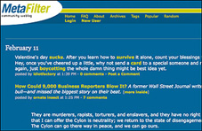 Đây là một blog cộng đồng tận dụng tốt nhất nguồn tin từ đám đông độc giả. Mỗi ngày trên Mefi (cái tên thân thuộc với các fan) đăng hàng tá tin tức sao chép lại (có trích dẫn nguồn) mà độc giả thấy hứng thú và muốn đem ra chia sẻ. Kết quả là có một sự đa dạng, phong phú bất ngờ các tin tức, từ những tin hữu dụng nhất tới những kiến thức vô dụng tới mức đáng kinh ngạc. Bên cạnh những kết quả mới nhất về lý thuyết dây và thuyết tiến hóa là những trao đổi thân mật hồi tưởng lại bộ phim truyền hình Các Thiên thần của Charlie, hay tin đồn về album mới của ban nhạc Spinal Tap. Có vô số kênh tin tức giao thoa như vậy trong thời văn hóa pop, nhưng chỉ có Metafilter coi nhiệm vụ của mình là hoàn toàn nghiêm túc. Gần đây, một cuộc tranh luận trên mạng nổ ra về việc liệu chú đà điểu, diễn viên chính trên loạt phim hoạt hình nổi tiếng trước đây, Road Runner, kêu “bip – bip” hay “mip – mip”, cuối cùng đã được phân định thắng thua bởi một thành viên tham gia trên blog, người từng có dịp ăn tối với tác giả bộ phim. Kết quả: mip – mip. Vậy là giờ bạn biết thêm được một điều mới!!
