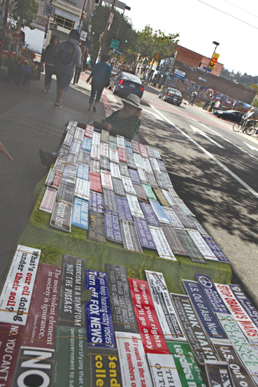 |Người đàn ông ngồi ở trước cổng trường Đại học Berkeley, ông ta bán những tấm biển, mỗi tấm thể hiện một quan điểm sống nào đó. Ví dụ: Suy nghĩ thật nghiêm túc, Cho nền hòa bình một cơ hội… |