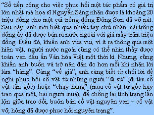 Họa sĩ Nguyễn Sáng lại cười: Đấy, cô xem, chỉ một chốc mà cô đã mê, huống gì tôi ba mươi năm ăn cổ vật, ngủ cổ vật, nằm mơ cổ vật… Anh nói đến quãng đời ba mươi năm gắn bó với những cổ vật và quá trình để trở thành người thợ – nghệ sĩ trong nghề phục chế này nhẹ nhàng như nói về một thoáng mây qua.