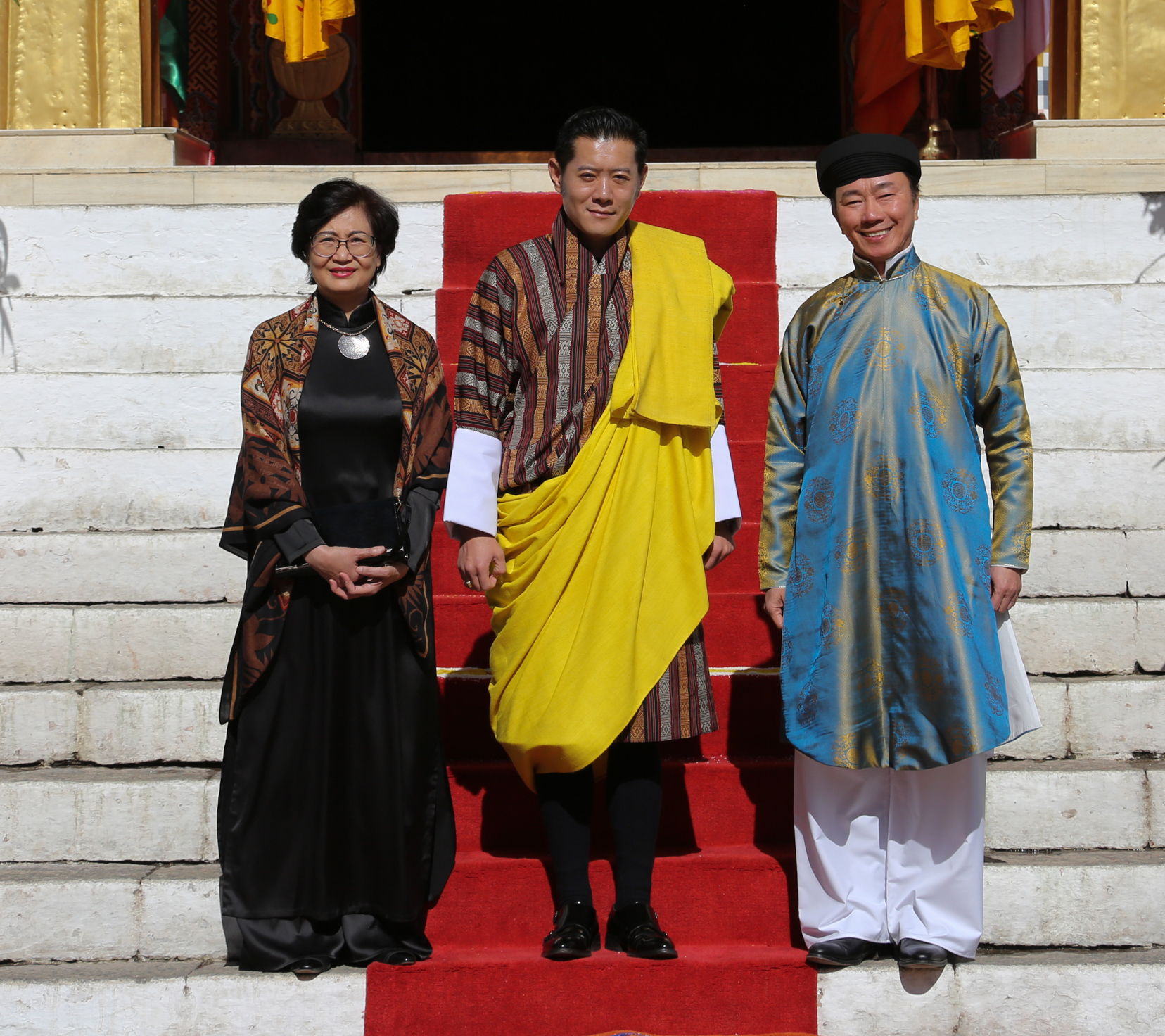 Đại sứ Phạm Sanh Châu và phu nhân chụp ảnh cùng Nhà vua Bhutan sau Lễ Trình Quốc thư. Ảnh: Hoàng gia Bhutan.
