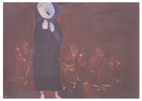 Tiếng hát hội họa của ông cất lên trong veo hy vọng hay trầm đục ai oán, nhiều khi như là sự gào kêu tuyệt vọng trong một không gian âm y, rất thân gần mà vô định với loạt tranh Những người nhà quê hát. Họ đứng đơn độc hay tụ tập thành một đám đông, đâu đó trên đường làng, dưới bóng cây, bên chuồng bò, trên mái nhà… Không gian rộng lớn trở nên đặc quánh, bức bí bởi tiếng hát hết cỡ từ các cơ thể kia không phát ra được thành âm thanh tới thính giác của ta. “Tiếng hát thị giác” có sức biểu cảm mãnh liệt. Một sự phẫn uất và hy vọng về tự do và đổi thay. Hội họa của Hà Trí Hiếu vươn tới một sự to lớn bên trong và một sự cô đúc hình thể đáng nể.