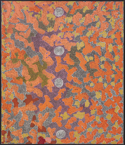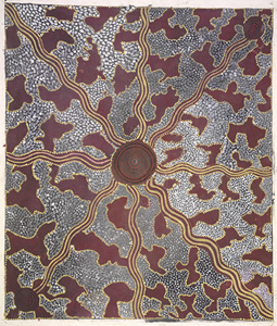 | Bức Honey Ant Hunt 1975 Tim Leura Tjapaltjarri Màu tổng hợp trên vải 1995 x 1710 mm Ba ngọn đồi ở Papunya là địa bàn của Kiến Mật Tổ tiên, chúng chỉ ra nơi mà các vị tổ tiên này an nghỉ sau các chuyến đi trong thời Dreamtime. Mạng lưới dưới mặt đất của kiến được xem như |