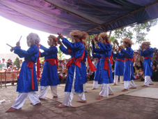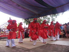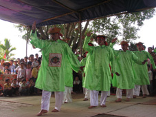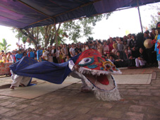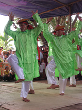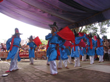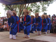 4. Điệu Hoa Lang, đi đầu là con kỳ lân, thực ra giống con thủy quái ở biển, múa sát đất như bơi lội. Đoàn người Hoa Lang có cô gái Việt ra đón tiếp, đầu đội mũ Kê pi cao, ngậm mặt nạ mũi thẳng, kết thúc là điệu bơi chèo. Họ vượt biển đến rồi lại trở ra biển để đi.