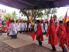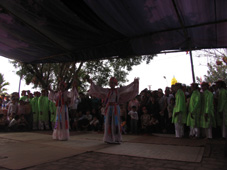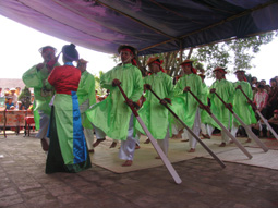 Cùng nhau kéo hàng vào gõ xênh, theo nhịp trống ba tiếng một mà đan cài nhau, theo tiếng xênh nói “hí hí hích”. Trống đánh giống điệu Tú Huần, nhưng khoan thai. Chỉ có Chúa ăn mặc khác quân, đầu mũ quan văn đen, không cánh chuồn, áo xanh chàm tay thụng có bối tử, bụng phệ , lưng gù, chân đi ủng. Vào bái một cách sợ hãi.