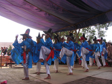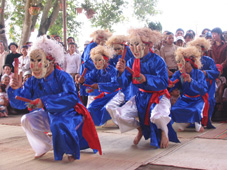 Trong năm điệu múa, thì chỉ ba điệu Chiêm Thành, Hoa Lang và Tú Huần có mặt nạ, đặc biệt trò Chiêm Thành và Hoa Lang người múa không đeo, mà ngậm mặt nạ nửa mặt bởi một chột gỗ vào miệng. Điệu Tú Huần, Hoa Lang và Ngô Quốc có bài hát, và riêng hai đoàn Hoa Lang và Ngô Quốc có nữ Việt ra tiếp đón.