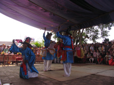 Trống đánh: cắc thùng cắc, cắc thùng cắc, thùng thùng thùng thùng thùng thùng cắc. Cứ cắc thì dậm chân, dậm hai cái rồi bước theo. Trong khi múa và bái có hô tiếng “Xi lô” 10 mái chèo như múa Hoa Lang.