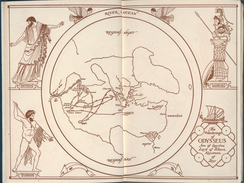 Bản đồ từ “Odyssey” của Homer, ấn bản năm 1935. © Oxford University Press, Inc./Reproduced with permission of the Licensor through PSLclear/Courtesy of The Huntington Library, Art Museum, and Botanical Gardens.