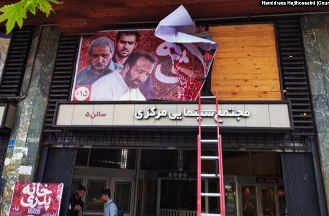 Một công nhân gỡ bỏ áp phích của bộ phimThe Parental House sau khi bị chính quyền Iran cấm chiếu.