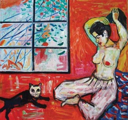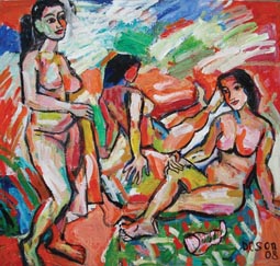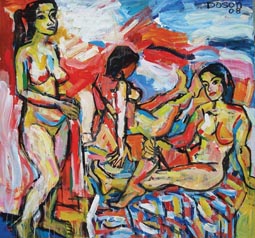Đỗ Sơn đặt tên cho triển lãm lần này của mình là Bảng Màu Nguyên. Đúng mà cũng chưa hẳn đúng. Tôi nghĩ toàn bộ cái không khí hội họa trong tranh Sơn là nguyên, là nguyên sơ, là ban đầu. Chả cứ bảng màu, hình, bút pháp…cũng vậy. Tất cả đều nguyên sơ, nguyên thủy, sơ khai, ngây thơ. Đỏ, xanh, vàng là màu nguyên, thỉnh thoảng xen vào đôi ba màu cơ bản và bổ túc nữa. Không pha phách theo nghĩa đen. Các màu nguyên đặt cạnh nhau, chúng tự hòa với nhau, tự pha lấy. Cách tạo hình ít nhiều kiểu trẻ con cũng là một kiểu nhìn đầu tiên. Bút pháp cũng vậy, những vệt, quệt ngang dọc, những nhát bút ngắn dài xanh đỏ rất tự nhiên, dường như không cố tình gì cả. Phóng túng, tự do, tung tẩy không phân biệt hình và nền, không cần biết đến đúng sai. Chỉ thỏa mãn đẹp. Bất chấp.